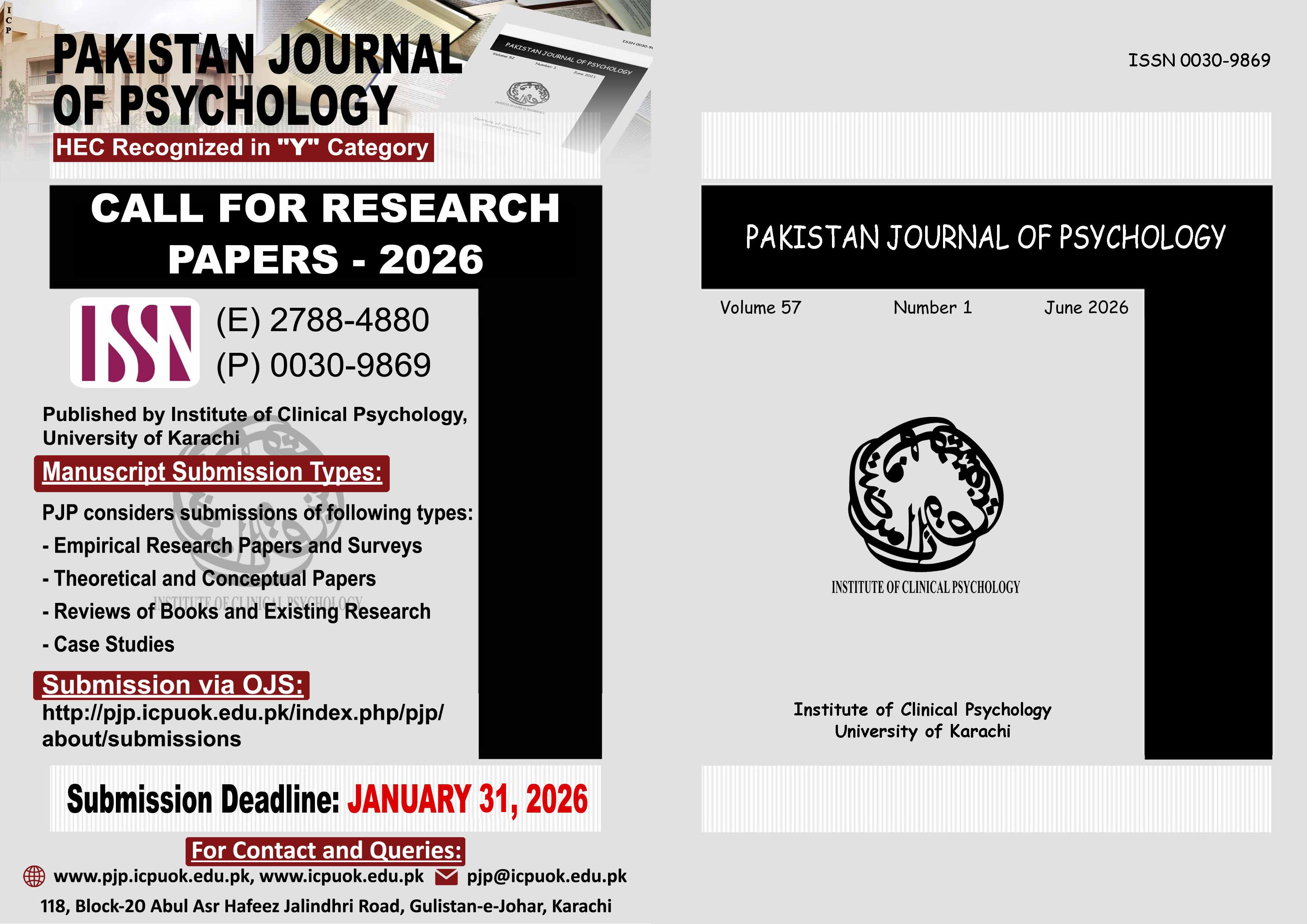 The Pakistan Journal of Psychology (PJP) is the official publication of the Institute of Clinical Psychology, the University of Karachi since 1965. The PJP is HEC recognized journal, Print ISSN 0030-9869 published biannually under the editorship of the Director, Institute of Clinical Psychology.